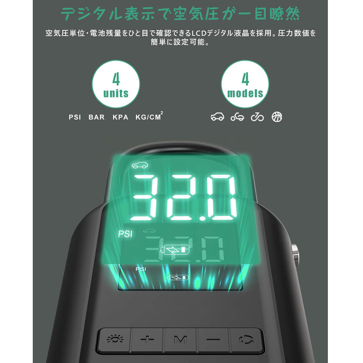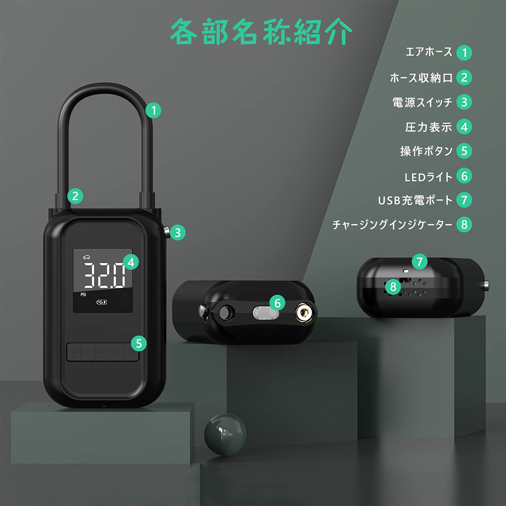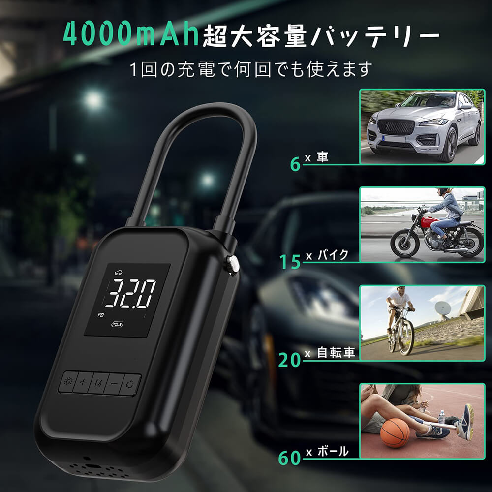 • 電動エアーポンプ 空気入れ エアーポンプ LEDライト付き 大画面ディスプレイ 車 バイク 自転車 ボール 電動ポンプ 最大圧力150PSI 4000mAh大容量バッテリー タイヤくうき入れ コンパクト
