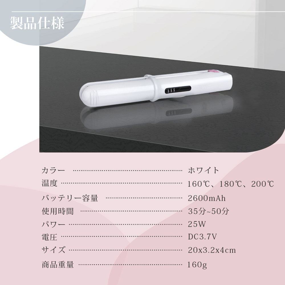 ヘアアイロン 美髪器  ヘアアイロンコードレス ミニ コテ ホワイトピンク USB充電式 3段階温度